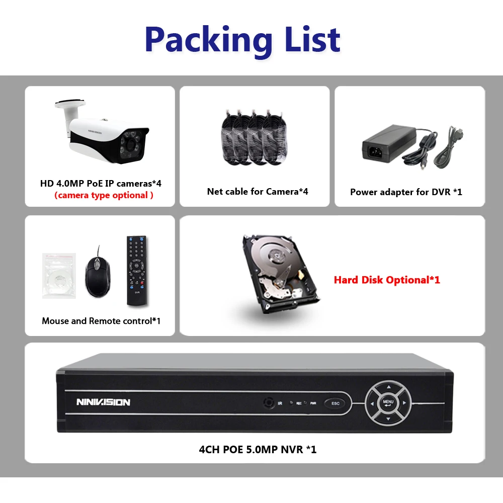 H.265 5MP 2592*1944 Surveillance CCTV System 48V PoE 4CH NVR Kit 4.0MP HD Bullet Waterproof indoor