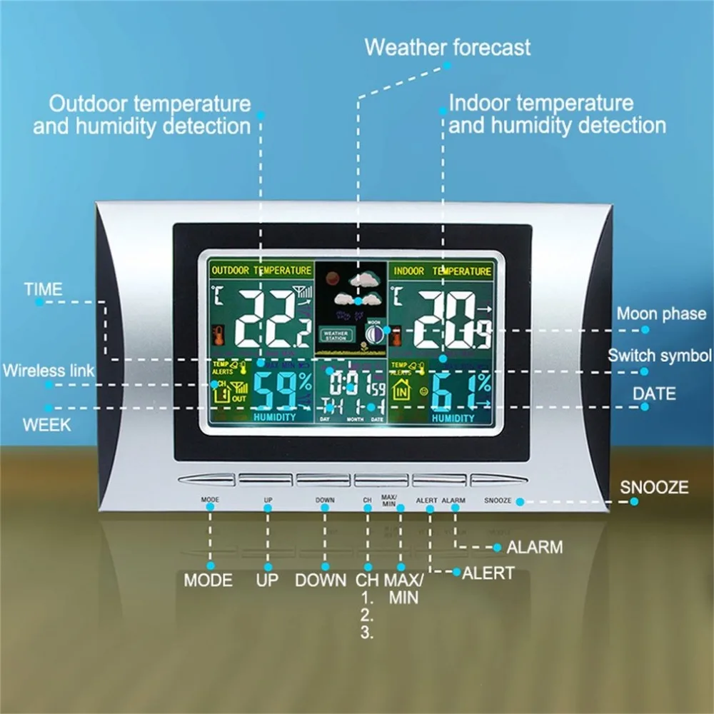 Weather Station Forecast Temperature Humidity Meter Sensor Tester Hygrometer Clock Alarm Indoor Out